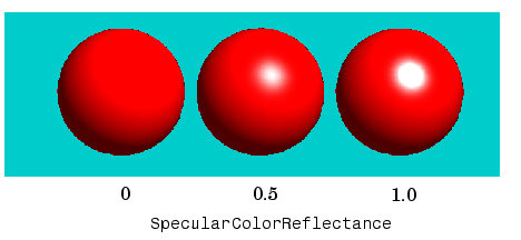 Цвет зеркально отраженного света может варьироваться от комбинации цвета объекта и цвета источника света до цвета только источника света. Участок и поверхность SpecularColorReflectance свойство управляет этим цветом. На этом рисунке показана красная сфера, освещенная белым светом. Значения SpecularColorReflectance свойство находится в диапазоне от 0 (цвет объекта и светлый цвет) до 1 (светлый цвет).