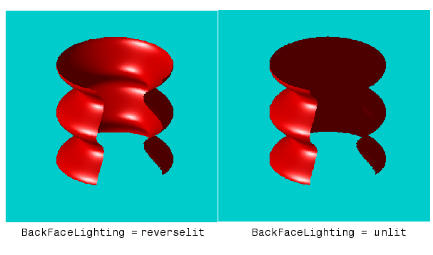 Значение по умолчанию для BackFaceLighting является reverselit. Этот параметр изменяет направление нормалей вершин, обращенных в сторону от камеры, что приводит к отражению света от внутренней поверхности к камере. Настройка BackFaceLighting кому unlit отключает освещение на гранях с нормалями, удаленными от камеры.