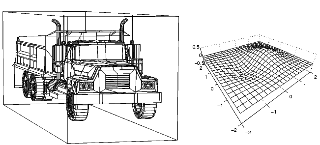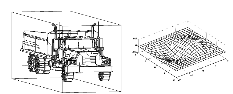 На этих рисунках показан чертеж самосвала (создан с помощью patch) и график поверхности математической функции с использованием ортогональной проекции.
