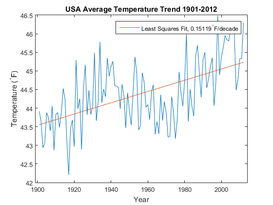 p = polyfit(years,temps,1); ptemps = polyval(p,years); deltat = p(1); hold on fl = plot(yearstoplot, ptemps); xlim([xmin xmax]) title('USA Average Temperature Trend 1901-2012') xlabel('Year') ylabel('Temperature (^{\circ}F)') deltat = num2str(10.0*deltat); legend(fl,['Least Squares Fit, ', deltat, '^{\circ}F/decade']) hold off
