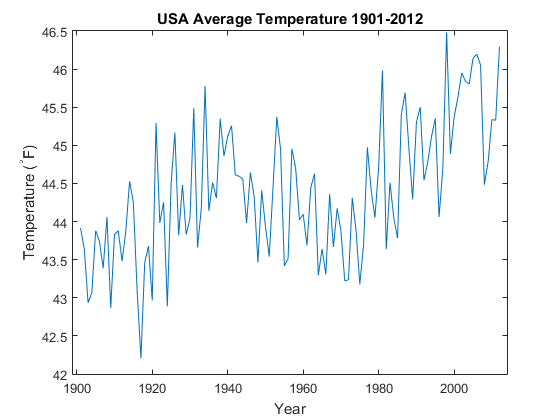 temps = [S.data]; temps = 9/5 * temps + 32; years = [S.year]; yearstoplot = datetime(years,1,1); figure plot(yearstoplot, temps); title('USA Average Temperature 1901-2012') xlabel('Year') ylabel('Temperature (^{\circ}F)') xmin = datetime(1899,1,1); xmax = datetime(2014,1,1); xlim([xmin xmax])