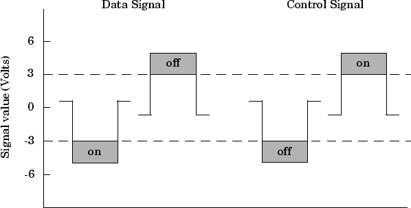 Для сигналов данных состояние «включено» возникает, когда напряжение принимаемого сигнала больше -3 вольт, в то время как состояние «выключено» возникает для напряжений больше 3 вольт. Для управляющих сигналов состояние «включено» возникает, когда напряжение принимаемого сигнала является более положительным, чем 3 В, в то время как состояние «выключено» возникает для напряжений, более отрицательных, чем -3 В. Напряжение от -3 вольт до + 3 вольт считается переходной областью, и состояние сигнала не определено.