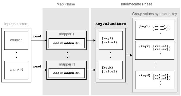 Затем функция отображения работает с отдельным блоком данных и добавляет одну или несколько пар ключ-значение к промежуточному блоку. KeyValueStore с использованием add или addmulti функции.