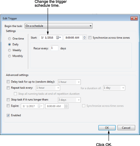 Чтобы изменить расписание запуска задачи, перейдите на вкладку Триггер (Trigger) в диалоговом окне свойств задачи. В списке отображаемых триггеров выберите триггер, который требуется изменить, и нажмите кнопку Изменить.
