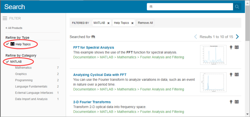 Результаты поиска можно фильтровать по фасетам, которые отображаются в левой части страницы. Например, просмотрите разделы MATLAB ®, выбрав MATLAB и разделы справки.