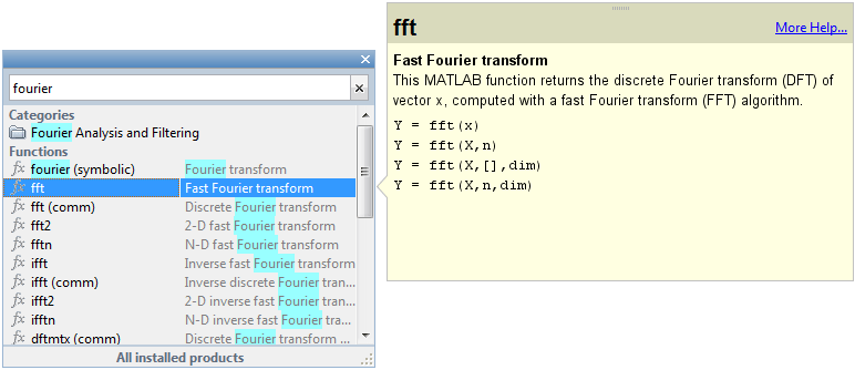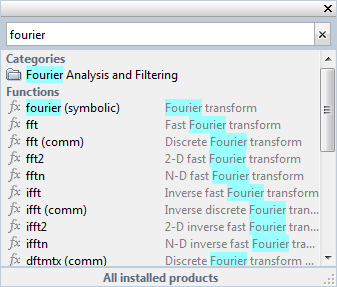 В результатах поиска выражение в скобках после имени функции указывает, что функция находится в папке продукта, отличной от MATLAB ®, или что существует несколько функций с одним и тем же именем. Например ,fft (comm) соответствует fft в папке Communications Toolbox™.