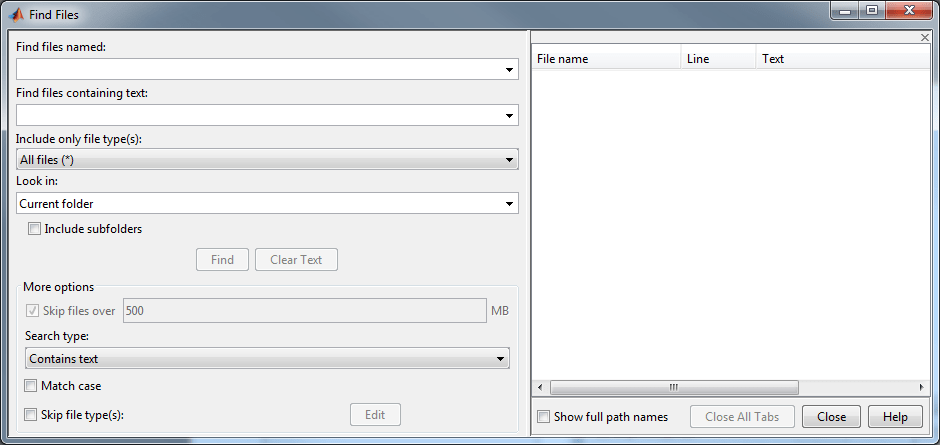 Можно искать файлы только с указанным расширением, выбрав опцию в меню Включить только типы файлов. Например, выберите * .m, * .mlx, чтобы ограничить поиск файлами программы MATLAB.