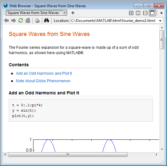 Другие HTML-файлы отображаются в веб-браузере MATLAB. Например, после публикации файла программы MATLAB в HTML файл HTML отображается в веб-браузере MATLAB: