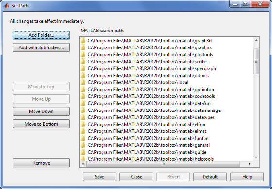 Можно также использовать диалоговое окно Задать путь (Set Path) для просмотра всего пути поиска MATLAB. На вкладке Главная (Home) в разделе Среда (Environment) щелкните Задать путь (Set Path). Откроется диалоговое окно Задать путь (Set Path) со списком всех папок на пути поиска. Дополнительные сведения об использовании диалогового окна Задать путь см. в разделе Изменение папок в пути поиска.