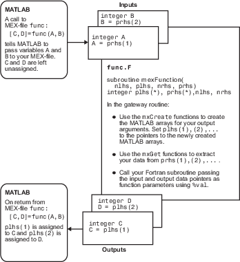 Подпрограмма шлюза использует mxCreate* для создания массивов MATLAB для выходных аргументов. Он устанавливает plhs[0] и plhs[1] к указателям на вновь созданные массивы MATLAB. Он использует mxGet* функции для извлечения данных из входных аргументов prhs[0] и prhs[1]. Наконец, он вызывает вашу вычислительную программу, передавая входные и выходные указатели данных в качестве параметров функции.