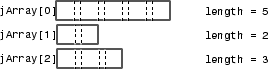 На следующем рисунке показан массив из трех нижележащих массивов разной длины. Термин зазубренный (или рваный) обычно используется для описания этого расположения элементов массива, поскольку концы массива не совпадают равномерно. Когда метод Java возвращает зазубренный массив примитивных типов Java, MATLAB сохраняет его в массиве ячеек.