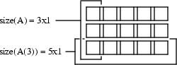size(A) возвращает размеры самого высокого уровня массива A. Самый высокий уровень массива имеет размер 3 на 1.