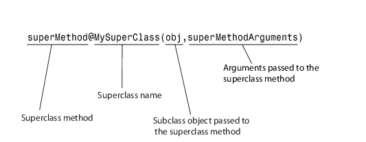 Методы подкласса могут вызывать методы суперкласса, если оба метода имеют одинаковые имена. Из подкласса укажите имя метода и имя суперкласса с помощью @ символ.