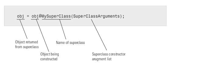 При создании объекта подкласса MATLAB ® вызывает конструктор суперкласса для инициализации части суперкласса объекта подкласса. По умолчанию MATLAB вызывает конструктор суперкласса без аргументов. Если требуется вызвать конструктор суперкласса с определенными аргументами, явным образом вызовите конструктор суперкласса из конструктора подкласса. Вызов конструктора суперкласса должен предшествовать любым другим ссылкам на объект .