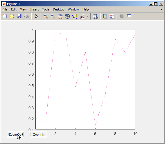 function addButtons(gobj) hfig = get(gobj.AxesHandle,'Parent'); uicontrol(hfig,'Style','pushbutton',... 'String','Zoom Out',... 'Callback',@(src,evnt)zoom(gobj,.5)); uicontrol(hfig,'Style','pushbutton',... 'String','Zoom In',... 'Callback',@(src,evnt)zoom(gobj,2),... 'Position',[100 20 60 20]); end