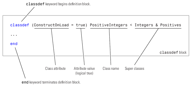 Определите классы MATLAB в кодовых блоках с подблоками, определяющими различные элементы класса. Сведения о синтаксисе этих блоков см. в разделе Компоненты класса.
