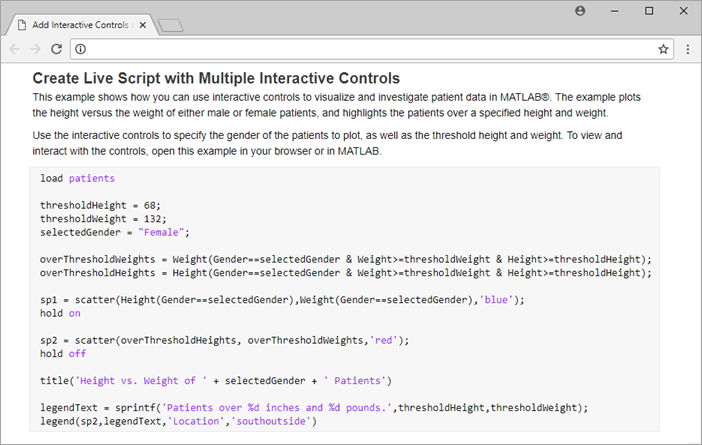 После завершения выполнения сценария поделитесь им с другими пользователями. Пользователи могут открывать живой сценарий в MATLAB ® и экспериментировать с использованием элементов управления в интерактивном режиме.