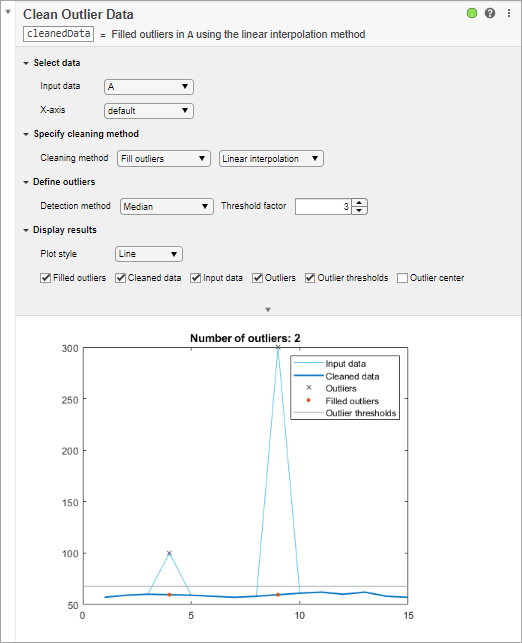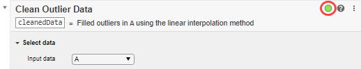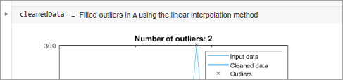По умолчанию при изменении значения параметров в задаче автоматически запускается задача и текущий раздел (включая другие задачи в разделе). Это обеспечивает актуализацию результатов и окружающего кода в разделе. Например, в сценарии live cleanmydata.mlxвесь раздел, включая код, который создает вектор шумных данных, повторяется каждый раз при изменении значения параметра в задаче «Очистить данные отклонения». Чтобы запустить только задачу, добавьте разрывы разделов до и после задачи. Дополнительные сведения о разделах и добавлении разрывов разделов см. в разделе Запуск разделов в интерактивных сценариях.