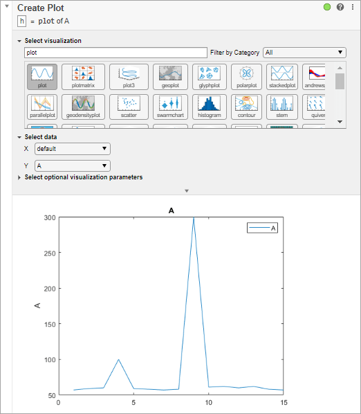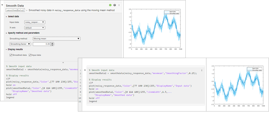 Задачи представляют собой серию команд MATLAB ®. Их вывод можно отобразить как в строке, так и справа. Чтобы просмотреть команды MATLAB, выполняемые задачей, просмотрите созданный код.