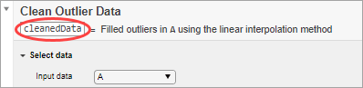 Добавьте задачу «Очистить данные об отклонениях» к сценарию в реальном времени, чтобы сгладить шумные данные и избежать искажения результатов. Чтобы добавить задачу, начните вводить слово clean в реальном сценарии и выберите Clean Outlier Data из предложенных завершений команды. В задаче задайте для параметра Входные данные значение A. Задача определяет и заполняет два отклонения в данных и создает переменную. cleanedData в рабочей области MATLAB с сохраненными результатами. Результаты также можно просмотреть на выходном графике задачи. Продолжайте изменять дополнительные параметры до тех пор, пока результаты не будут удовлетворены.
