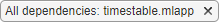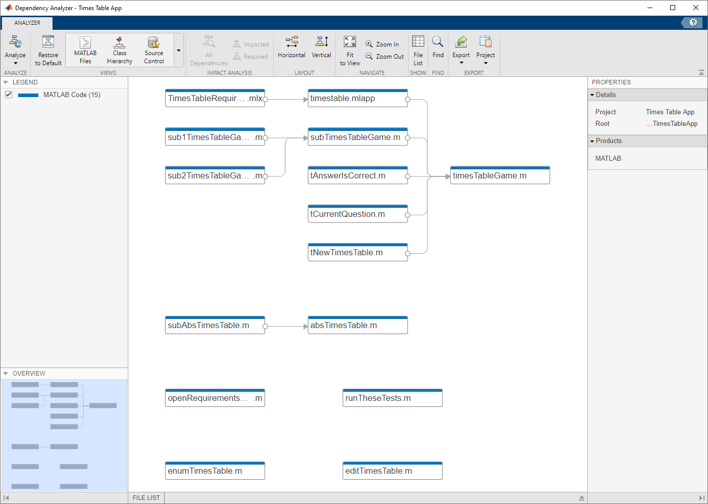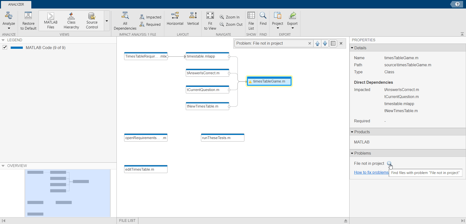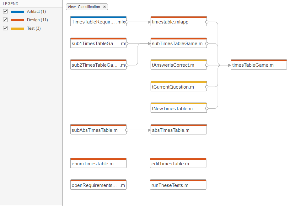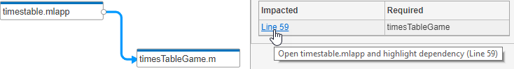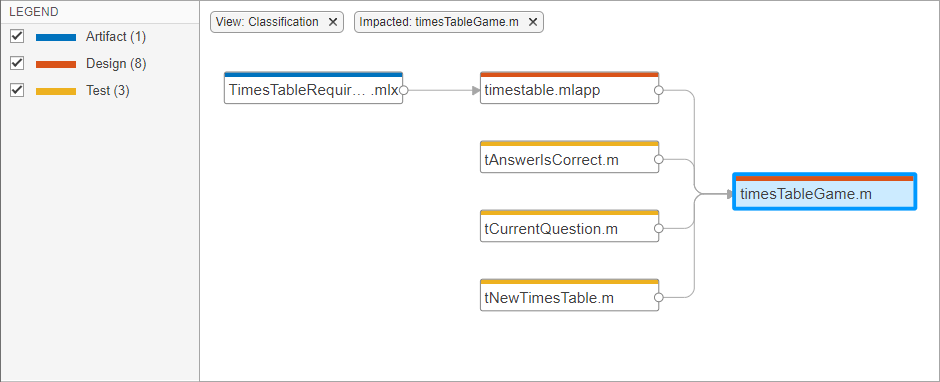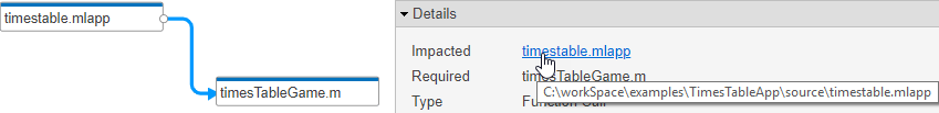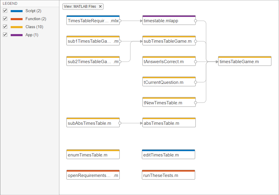 Чтобы показать только зависимости конкретного файла, выберите файл и в разделе Анализ воздействия щелкните Все зависимости. На графике показан выбранный файл и все его зависимости. Чтобы сбросить график для отображения всех зависимостей проекта, удалите фильтр в верхней части графика. Например, если фильтровать по всем зависимостям timestable.mlapp, чтобы удалить фильтр, щелкните.![]()