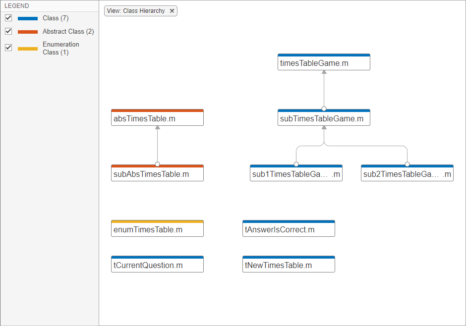 Представление «Иерархия классов» показывает график наследования классов и окрашивает файлы по типу (класс, класс перечисления или абстрактный класс). Если класс отсутствует в пути поиска, анализатор зависимостей не может определить тип класса.