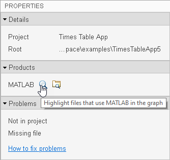 В анализаторе зависимостей на панели Свойства в разделе Изделие отображаются необходимые продукты для всего проекта. Чтобы просмотреть продукты, требуемые определенным файлом, выберите файл, щелкнув график.