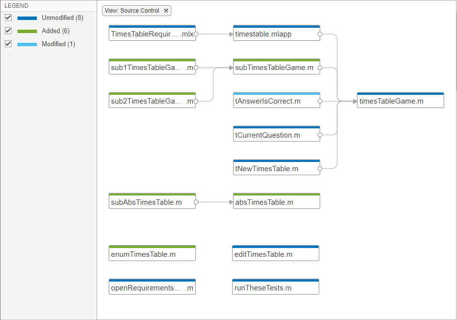 Связи между исходным и производным файлами (например, .m и .p файлы, .slx и .slxp, .ssc и .sscp, или .c и .mex файлы), а также между исходным и заголовочным файлами C/C + +. Можно просмотреть, какой код создается каждой моделью, и найти код, который необходимо регенерировать при изменении модели.