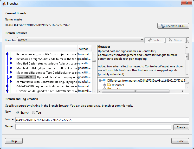 В папке репозитория Git™ щелкните правой кнопкой мыши пробел в браузере «Текущая папка» и выберите «Система управления версиями» > «Ветви». В диалоговом окне «Ветви» можно просматривать, переключать, создавать и объединять ветви.