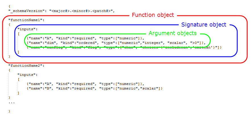 functionSignatures.json содержит один объект JSON. JSON использует скобки для определения объектов и ссылается на объекты как коллекции пар имен и значений. Поскольку эти термины перегружены в контексте сигнатур функций, вместо «name» используется «property». Объект JSON в functionSignatures.json содержит дополнительную версию схемы и список объектов функции. Каждый объект функции содержит список объектов сигнатуры, а каждый объект сигнатуры содержит массив объектов аргументов. JSON использует скобки для определения массивов.