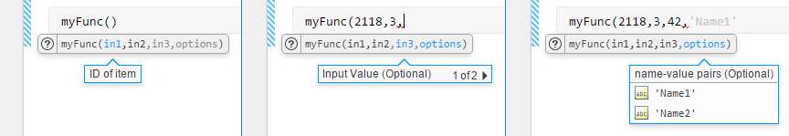 Чтобы поэкспериментировать с предложениями кода в Live Editor, вызовите myFunc из живого сценария. Появятся имена и цели из файла JSON. MATLAB указывает, когда аргументы являются необязательными и есть ли несколько предложений (например, третий позиционный аргумент или пара имя-значение). Перечислены опции пар «имя-значение».