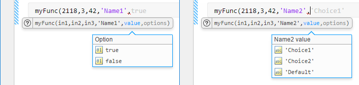 При добавлении аргумента пары имя-значение к вызову функции MATLAB представляет варианты из файла JSON. С тех пор 'Name1' определяется как логический скаляр, MATLAB заполняет варианты автоматически (true или false). MATLAB принимает три значения для 'Name2' из файла JSON.