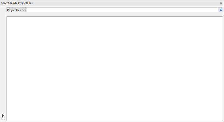 На вкладке «Проект» нажмите кнопку «Поиск». Откроется диалоговое окно Поиск внутри файлов проекта (Search Inside Project Files).