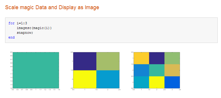 Следующий код запускает for цикл три раза и выдает выходные данные после каждой итерации. snapnow команда захватывает все три изображения, созданные кодом.