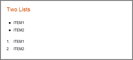 %% Two Lists % % * ITEM1 % * ITEM2 % % # ITEM1 % # ITEM2 %
