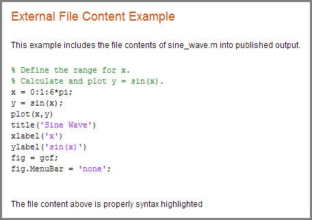 Например, этот код вставляет содержимое sine_wave.m в опубликованные выходные данные: