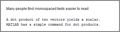 %% % Many people find monospaced texts easier to read: % % A dot product of two vectors yields a scalar. % MATLAB has a simple command for dot products.