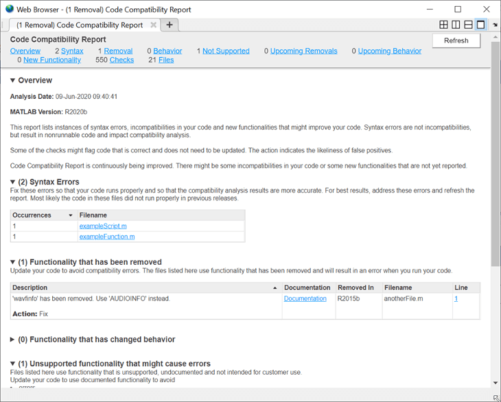 Для создания отчета, который открывается в веб-браузере MATLAB ® программным способом, используйте codeCompatibilityReport функция.