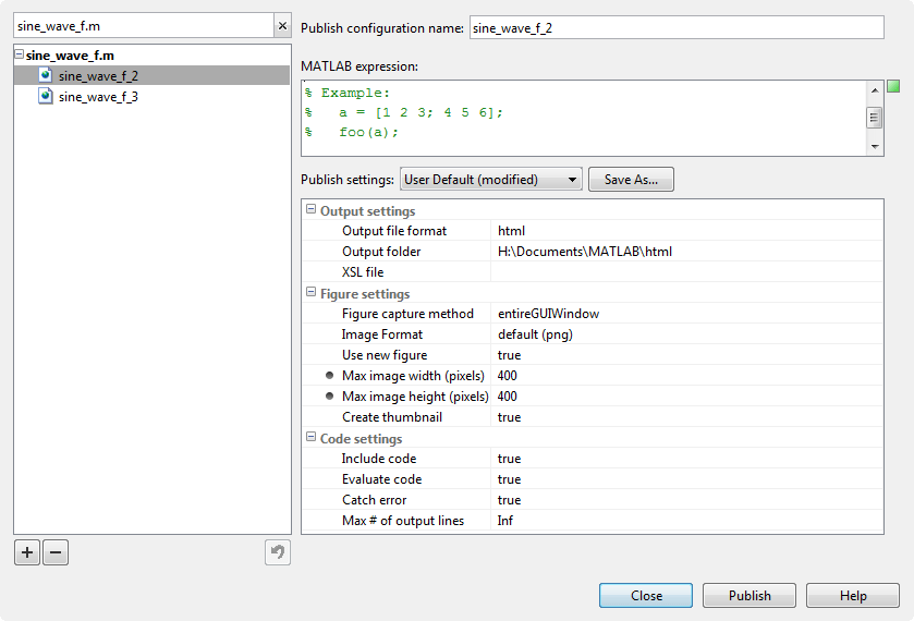 Вместе код на панели выражений MATLAB и параметры на панели параметров публикации создают конфигурацию публикации, связанную с одним файлом. Эти конфигурации обеспечивают простой способ ссылки на настройки публикации для отдельных файлов.