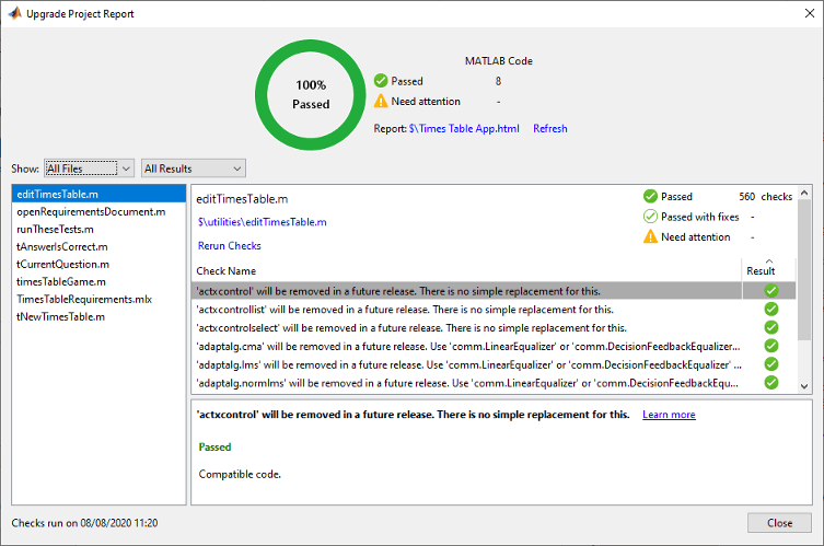 Для проектов, содержащих только файлы MATLAB, можно проверить наличие проблем совместимости с текущей версией MATLAB. На вкладке Проект выберите Выполнить проверки > Обновить.