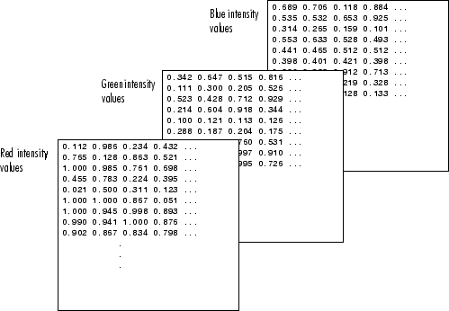 Рассмотрим изображение RGB с тремя массивами, соответствующими значениям интенсивности цвета.