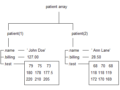 patient(1).test = [79, 75, 73; 180, 178, 177.5; 220, 210, 205];Дополнительные пациенты соответствуют новым элементам в структуре. Например, добавьте элемент для второго пациента: