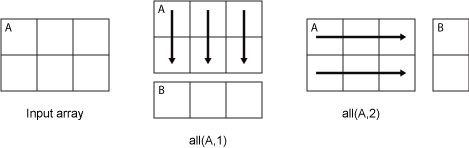 тесты вдоль первого размера массива B = all(A)A размер которого не равен 1, и определяет, являются ли все элементы ненулевыми или логическими 1 (true). На практике, all является естественным расширением логического оператора AND.