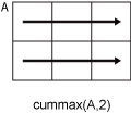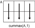 Если A является многомерным массивом, то cummax(A) возвращает массив того же размера, содержащий накопительные максимумы вдоль первого измерения массива A размер которого не равен 1.