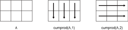 Если A является матрицей, то cumprod(A) возвращает матрицу, содержащую кумулятивные продукты для каждого столбца A.
