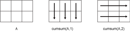 Если A является матрицей, то cumsum(A) возвращает матрицу, содержащую кумулятивные суммы для каждого столбца A.