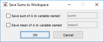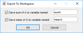 export2wsdlg( создает модальное диалоговое окно с рядом флажков и полей редактирования. Для каждого флажка имеется соответствующее поле редактирования. Аргументы следующие:labels,vars,vals)