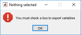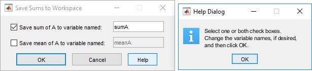 Выполнение программы MATLAB продолжается, даже если активно модальное диалоговое окно Экспорт в рабочую область (Export to Workspace). Чтобы заблокировать выполнение программы до тех пор, пока пользователь не закроет диалоговое окно, используйте uiwait функция.