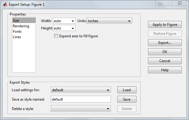 exportsetupdlg применяет выбранные значения к текущей фигуре. Если фигуры не существует, MATLAB создает новую фигуру.