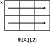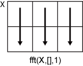 Если X является многомерным массивом, то fft(X) обрабатывает значения вдоль первого размера массива, размер которого не равен 1, как векторы и возвращает преобразование Фурье каждого вектора.